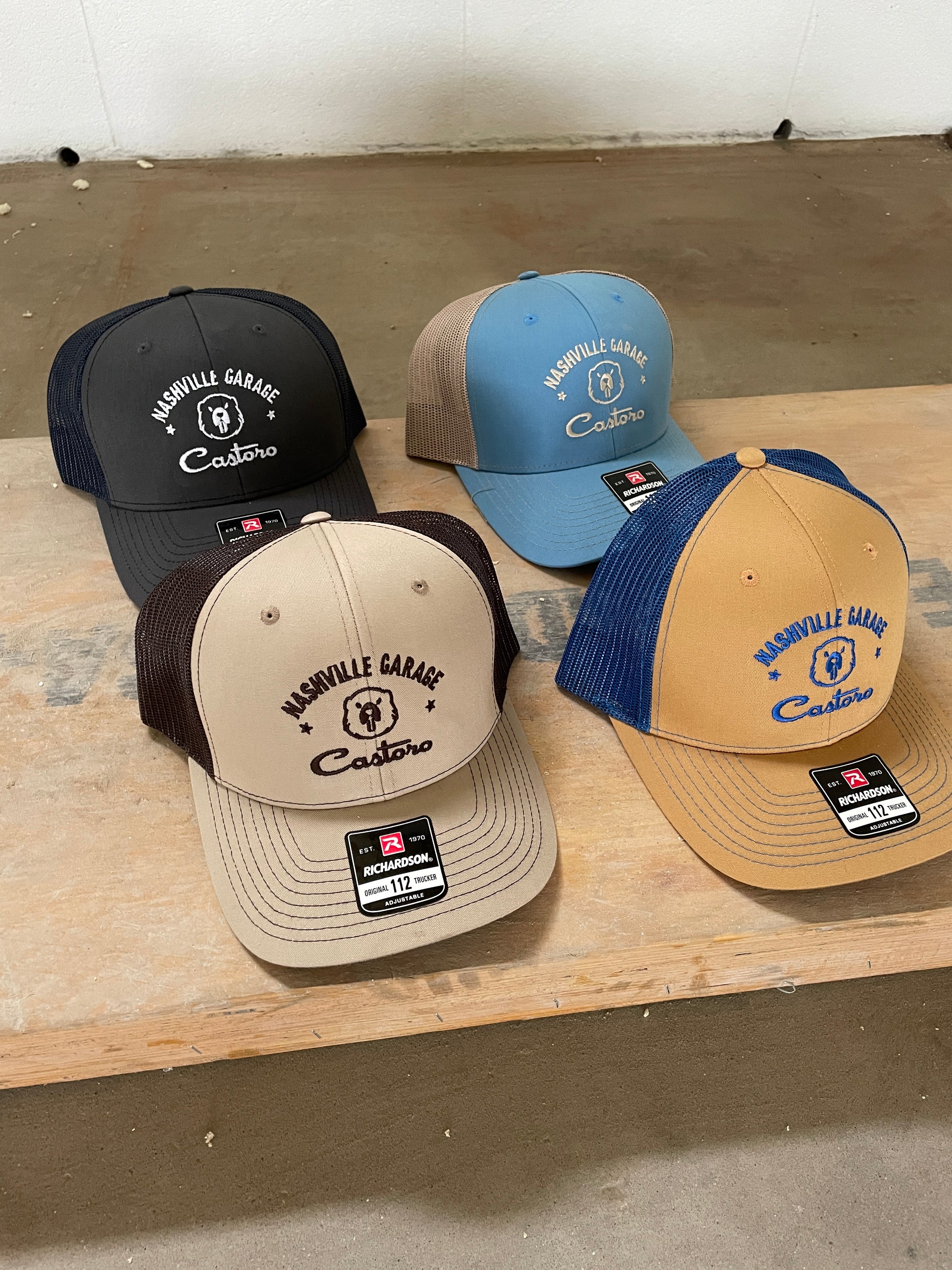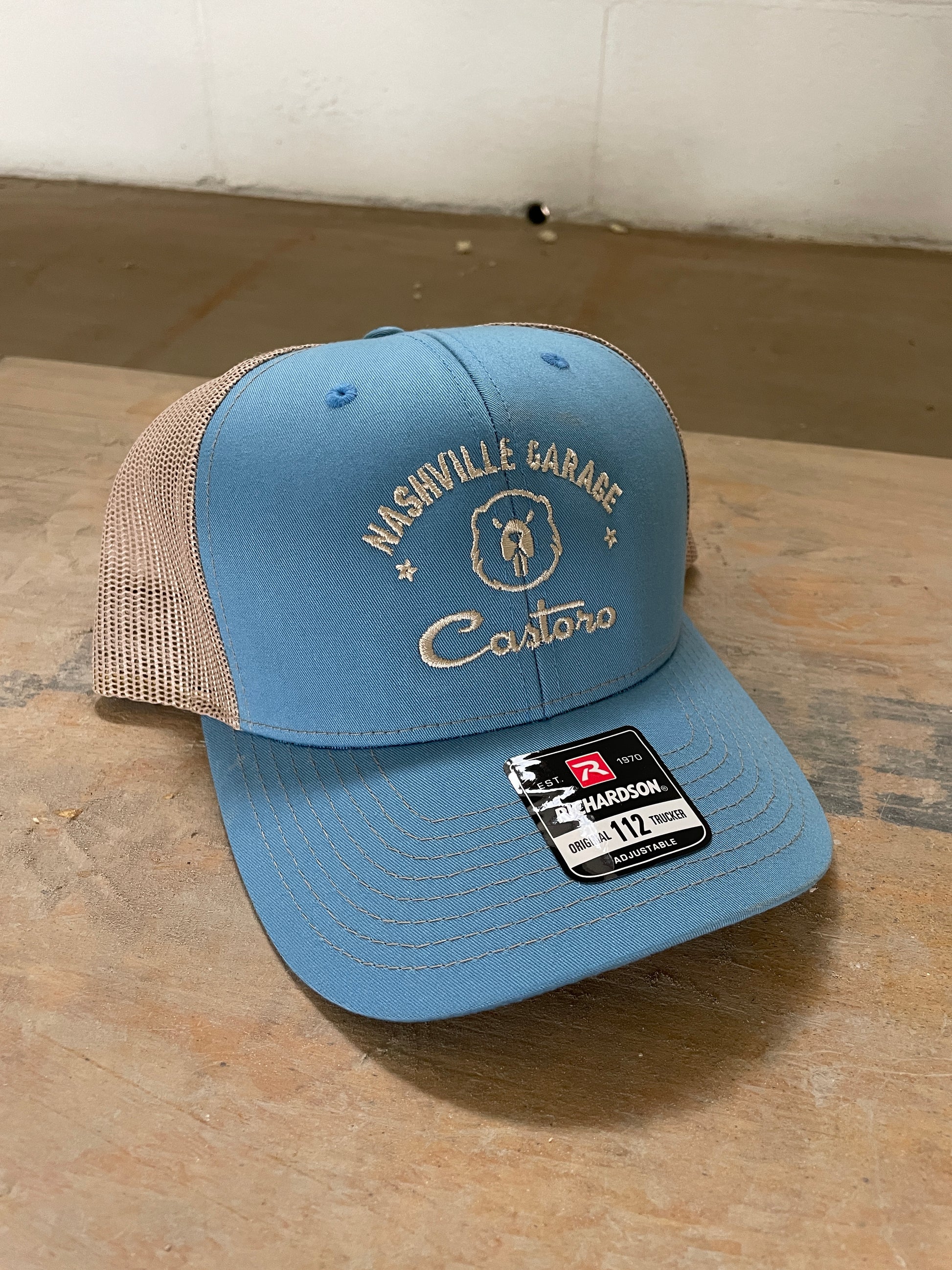 Two toned Castoro embroidery; Richardson 112 adjustable trucker hat; columbia blue front, khaki back